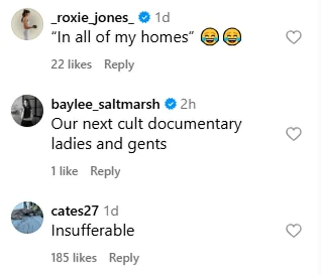 Social media users have called her tone-deaf, with one commenter writing, ‘In all of my homes,’ very relatable,’ while another mocked her ‘vapid’ detachment from reality.