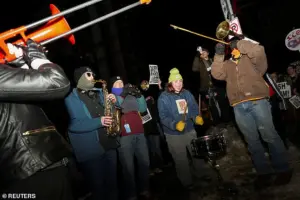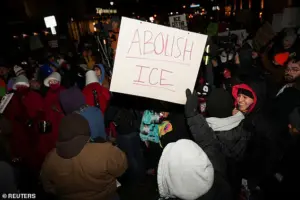 Protesters blocked traffic, sprayed graffiti on nearby buildings, and waved signs decrying ICE as ‘fascists’ and ‘murderers.’ One demonstrator, identified as Drey, 27, claimed she had spotted an ICE van nearby earlier in the evening and insisted the group would ‘do whatever it takes to keep Minneapolis safe.’ Her sentiment echoed among many in the crowd, who expressed a deep distrust of federal immigration enforcement and a desire to hold corporations accountable for hosting ICE agents.