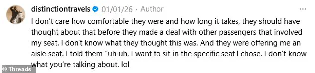 Why is this a thing?’ His frustration was palpable, as he emphasized that the couples had not only disrupted the seating plan but also imposed an inconvenience on him. ‘I don’t care how comfortable they were and how long it takes, they should have thought about that before they made a deal with other passengers that involved my seat,’ he added.
